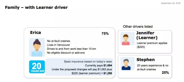 为了帮助民众更清楚有L车牌的新规定,ICBC举例:温哥华车主Erica妈妈驾龄20年,无事故;老公Stephen驾龄20年以上,无事故;女儿Jennifer刚开始学车,持L牌,一家三口共用这辆车。