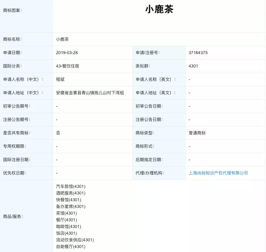 根据天眼查,“小鹿茶”商标43-餐饮住宿,被一个叫“程斌”的名字于2019年3月28日申请注册。