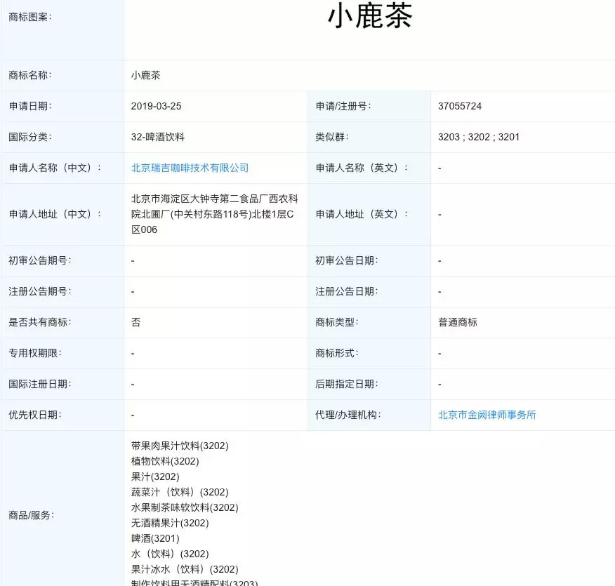 小鹿茶32-啤酒饮料申请主体为北京瑞吉咖啡技术有限公司,该公司法定代表人为瑞幸咖啡创始人钱治亚,注册于3月25日。