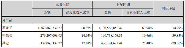 在近20亿元的营收中,葵花子在今年上半年卖了13.70亿元,营收占比高达68.93%,较去年同期占比提高了约5个百分点。葵花子35.28%的高毛利率也是公司净利润增速优于营收增长的一大因素。