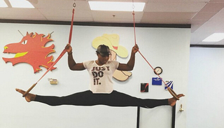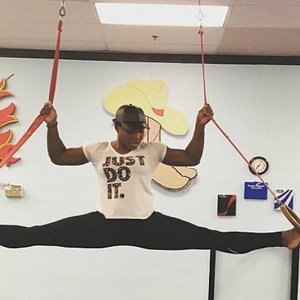 在照片中,小威廉姆在一块垫子上腾空而起,双脚分开,缠绕在吊环的环子里,秀出自己的大好身材。