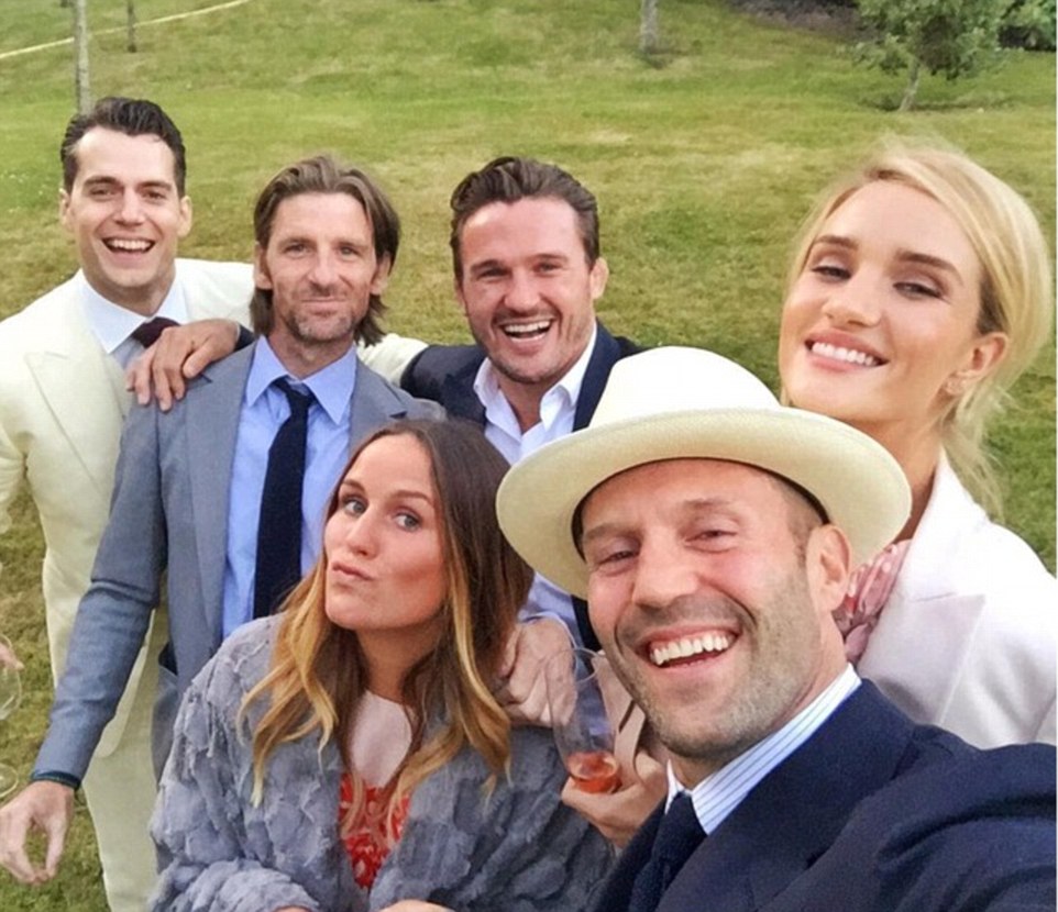一起来合照:不仅《秘密特工》(The Man From U.N.C.L.E)主演亨利·卡维尔(最左)来了,《左轮手枪》(Revolver)主演杰森·斯坦森(Jason Statham)(右下)也携带女友罗茜·汉丁顿-惠特莉(Rosie Huntington-Whiteley)一起出席婚礼。