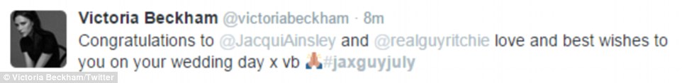 小贝的妻子维多利亚也送上了她的祝福,只是很遗憾并没有出席婚礼现场。
