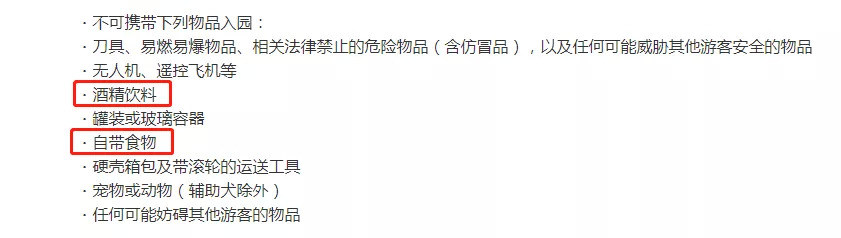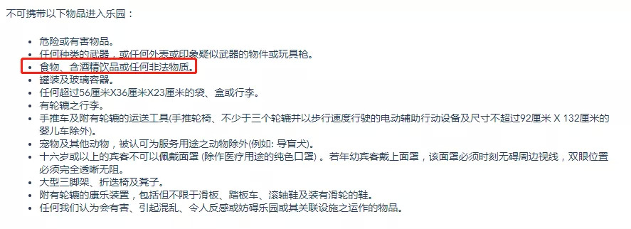 香港迪士尼乐园则规定不允许携带食物、含酒精饮品或任何非法物质,并且很多网友均证实实际也在按照此执行。