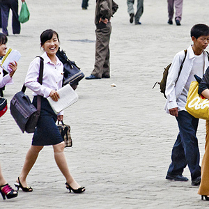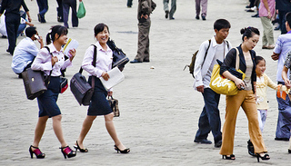 路人看起来多是步行去上班或上学。朝鲜女性爱美,虽然没有化妆,但普遍穿着丝袜,裙摆徘徊在小腿和膝盖附近,高跟鞋或低跟凉鞋在马路上“噔噔”直响,还有些女士穿民族服装去上班。款式虽不及国内一线城市新潮,但衣装都很洁净。