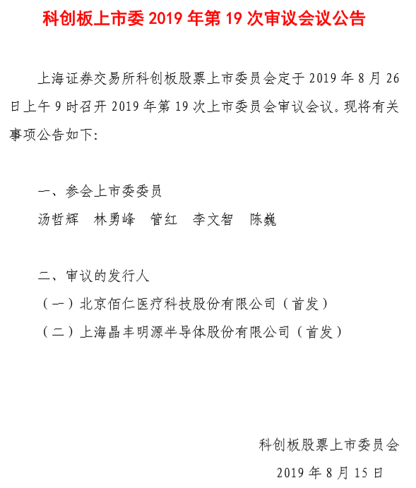 据上交所8月15日披露,科创板上市委员会定于2019年8月26日上午9点召开第19次上市委员会审议会议,会议将审议两家公司的首发,这其中就有晶丰明源。