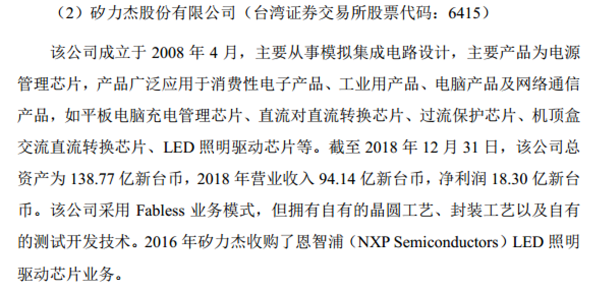 资料显示,晶丰明源成立于2008年10月31日,其主营业务为电源管理驱动类芯片的研发销售,公司产品包括LED照明驱动芯片、电机驱动芯片等电源管理驱动类芯片。而杭州矽力杰成立于2008年4月22日,比晶丰明源成立时间早了半年,该公司注册资本6825万美元,控股股东为矽力杰股份有限公司(下称矽力杰股份)。矽力杰股份成立于2008年4月,中国台湾证券交易所股票代码6415,主要从事模拟集成电路设计,主要产品为电源管理芯片,产品广泛应用于消费性电子产品、工业用产品、电脑产品及网络通信产品,如平板电脑充电管理芯片、直流对直流转换芯片、过流保护芯片、机顶盒交流直流转换芯片、LED照明驱动芯片等。在招股说明书中,晶丰明源将矽力杰股份列为主要的竞争对手之一。