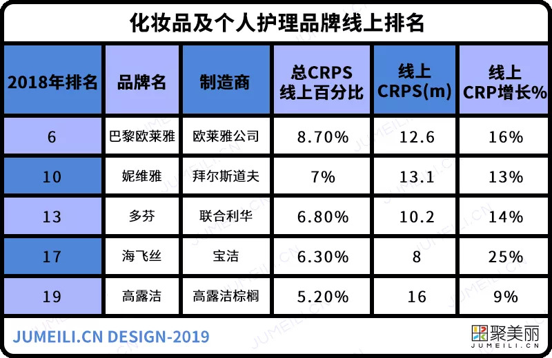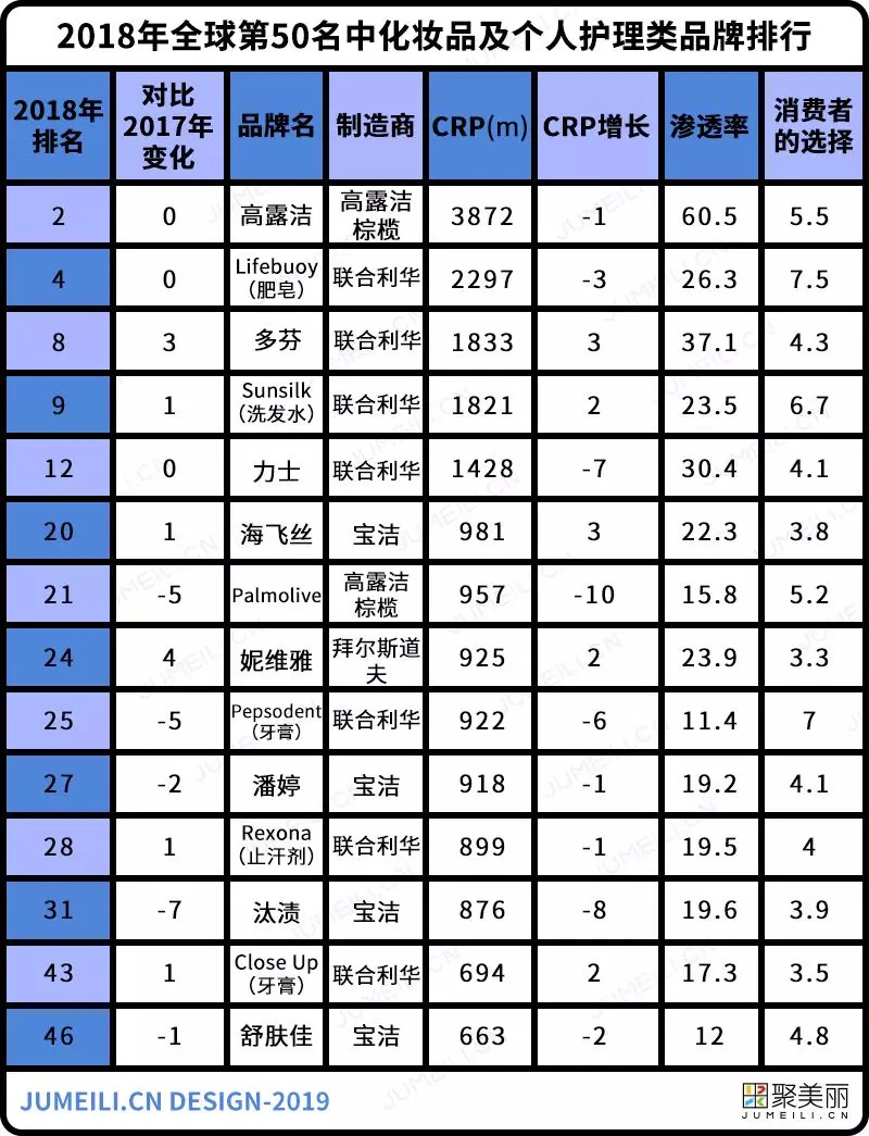 在今年2019年报告中,化妆品和个人护理品牌中有14个品牌强势进入前50名,其中4个进入了前十:高露洁(排名2);Lifebuoy(4);多芬(8);和Sunsilk(9)。在欧洲,妮维雅是最受欢迎的品牌。
