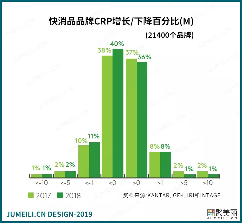快消品市场在2018年继续放缓,相比2017年2.8%的增速,今年降至2.1%。这也反映在品牌数量的增长和下降上,2018年54%的品牌CRPs下降,2017年下降品牌则为51%。