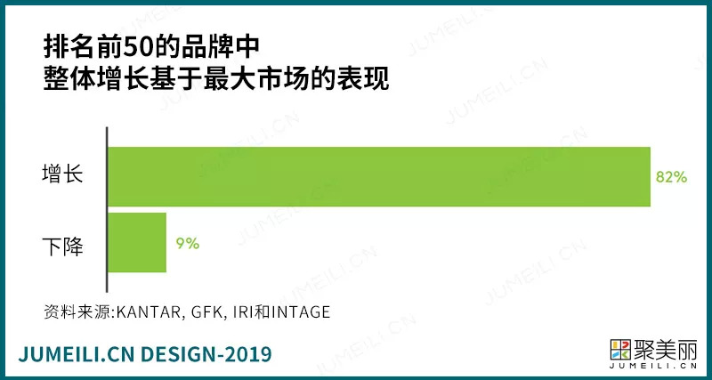 要想成长,重要的是要在你最大的市场中成长。在排名第一的50个品牌中,82%的品牌整体增长,这是一种简单而直观的方法,但只有前50名品牌中的一半遵循了这种方法。