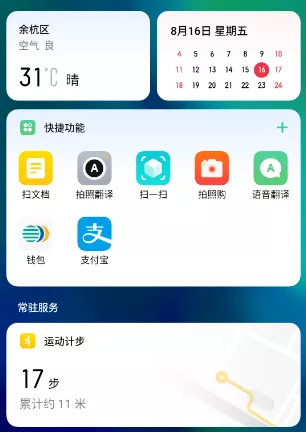 就拿负一屏来说,各大厂商都在做,基本的新闻咨询啊、天气日程啊大家也都有整合,周全一点的系统会有支付宝的付款码。