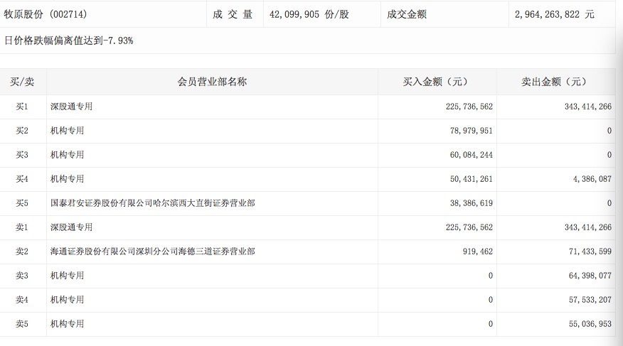 整个猪肉板块当日跌幅最大达2.48%,截至收盘,猪肉板块翻红上涨0.67%。下跌幅度最大的牧原股份盘后登上龙虎榜,盘后数据显示,牧原股份日价格跌幅偏离值达到-7.93%,成交金额29.64亿元,成交量4209.99万股。