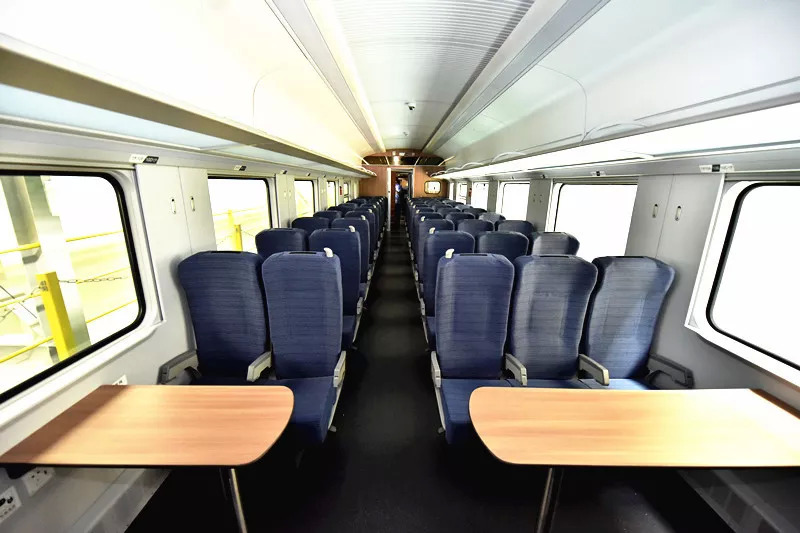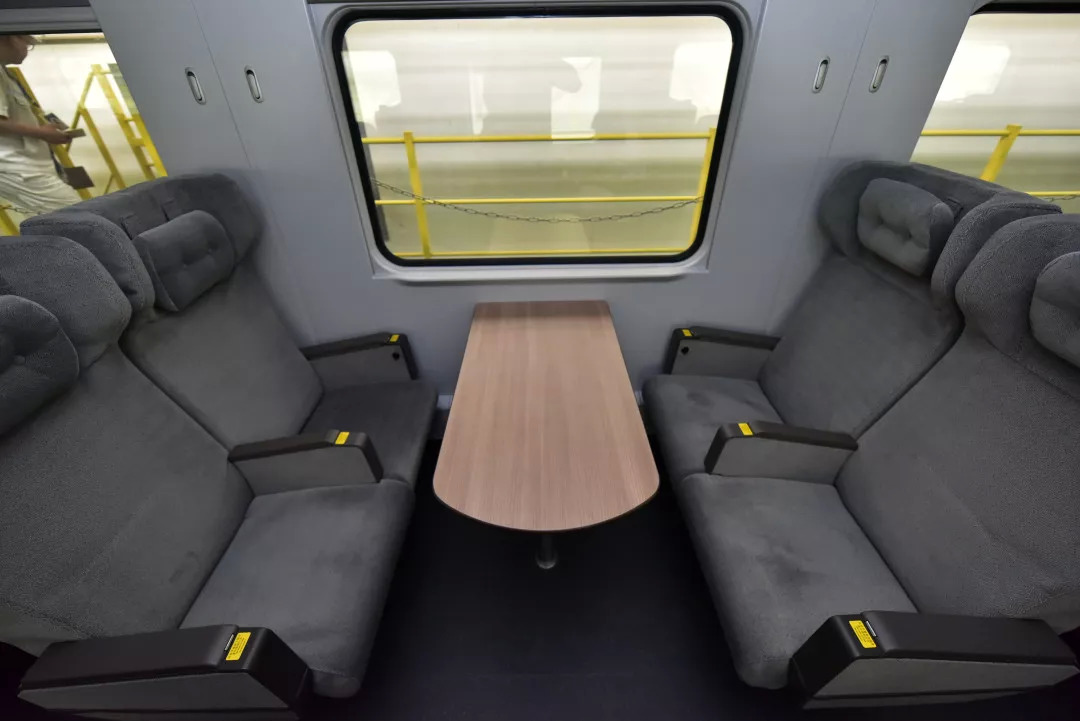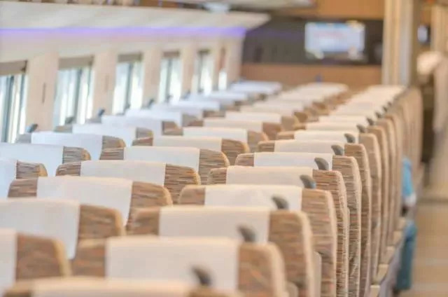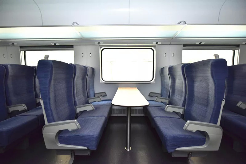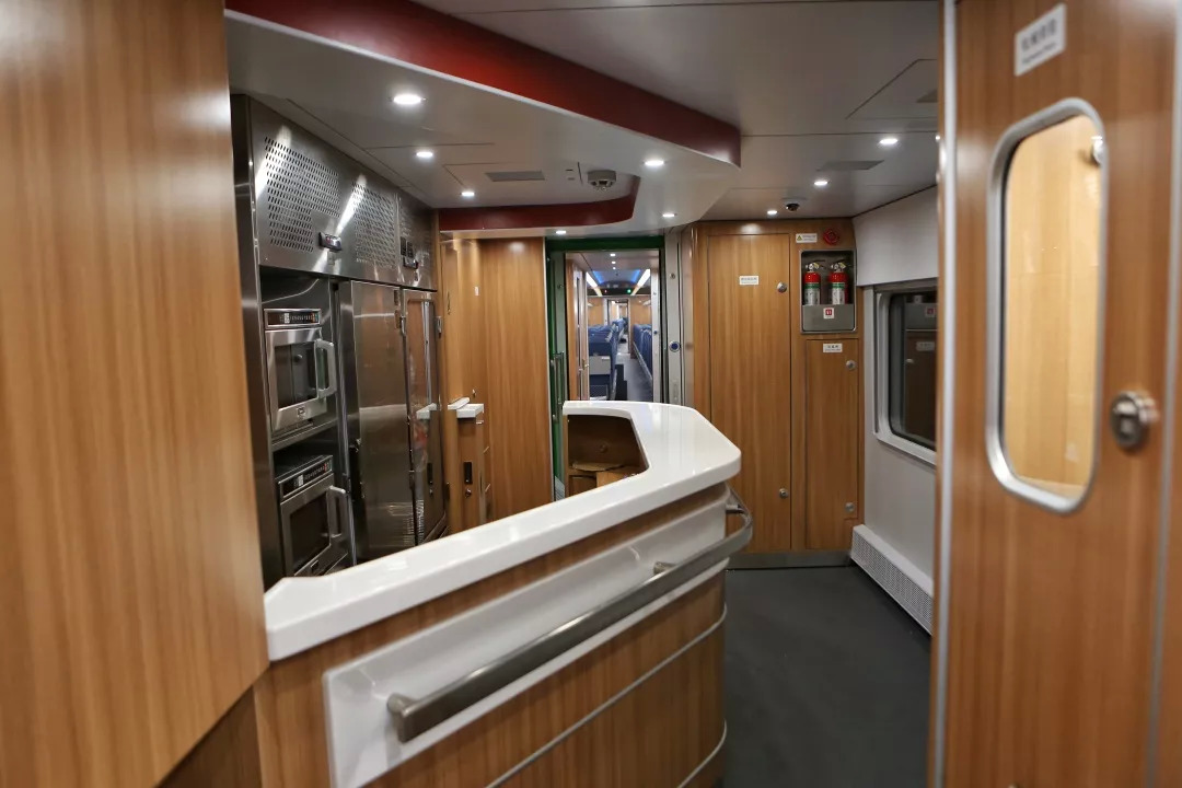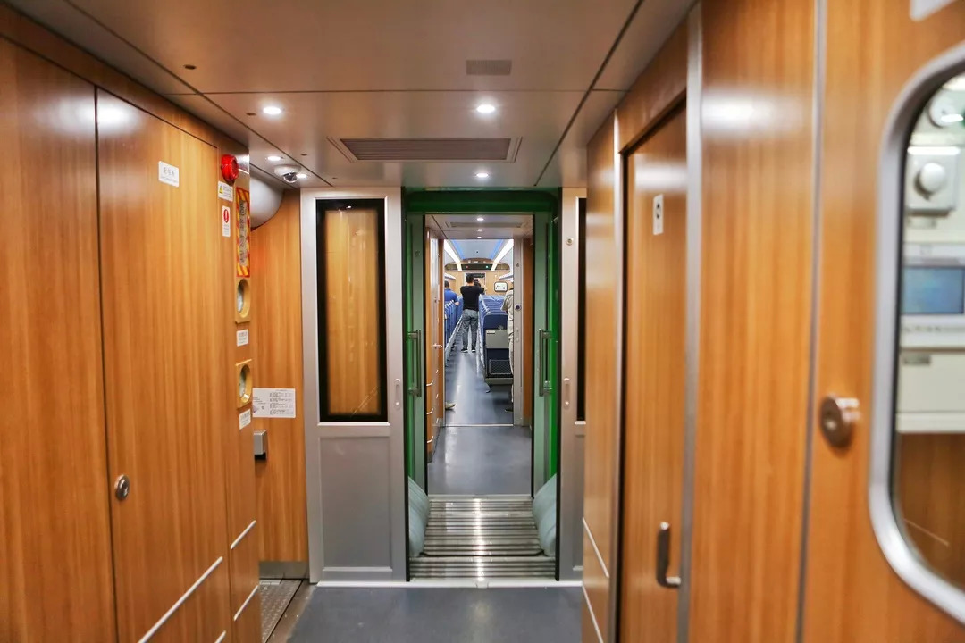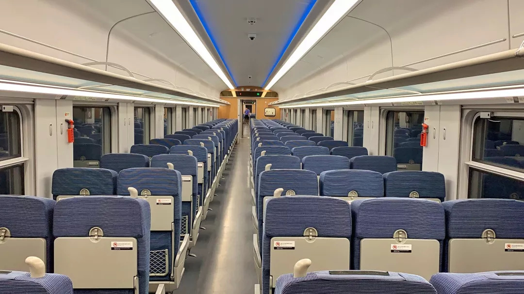 传统的绿皮车座位是直背的,椅背不能调节。虽然“小青”内部服务设施设备与既有动车组基本一致,但座椅椅背不仅可以调节,座椅的间距也比以前大了不少。