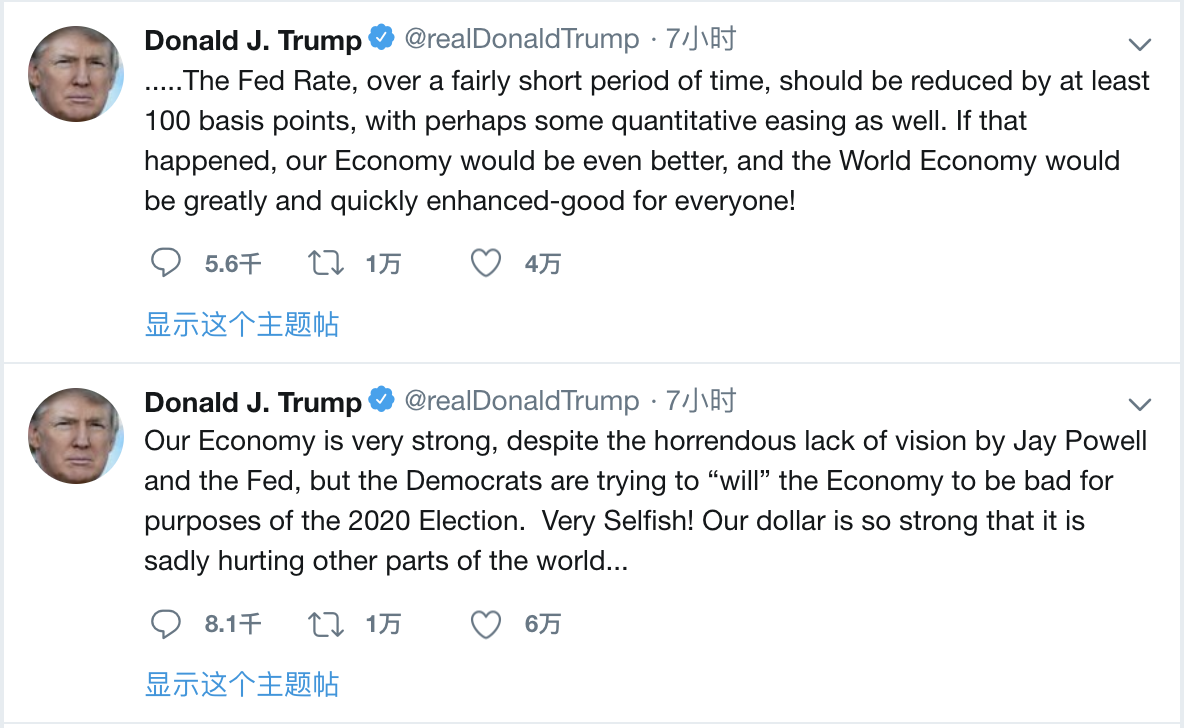 “联邦利率应在短期内再降至少100个基点,(美联储)或许还应同时启动量化宽松,”特朗普在周一的推特中写道,“如果这样,我们经济将会有更好的表现,全球经济也很快会得到极大的提振,这对所有人都好!”