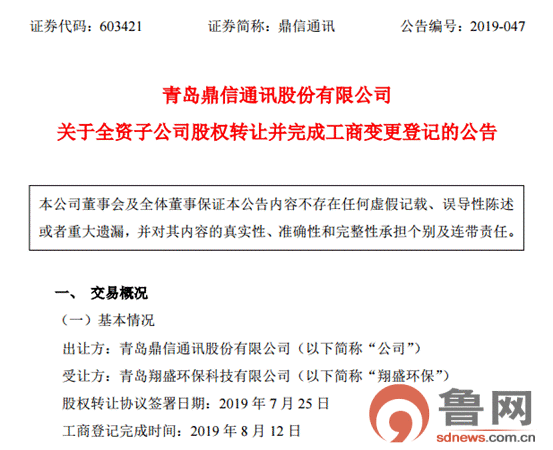 公告显示,鼎信通讯出于战略调整需要,与翔盛环保达成《股权转让合同书》,并于2019年7月25日签署转让协议,将其持有的鼎信电子100%股权以人民币2,551.8万元的价格转让给翔盛环保。8月12日,鼎信电子完成股权过户等工商变更登记,变更为由翔盛环保 100%持股。翔盛环保已按约定支付全部股权转让价款。