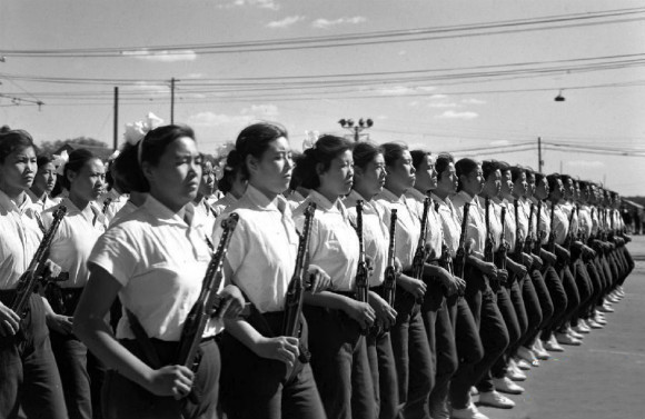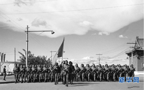 9. 这是1958年国庆阅兵式上,女民兵方队通过天安门广场。