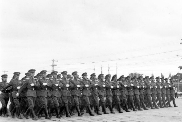 6. 这是1955年国庆阅兵式上,身着新式军装的坦克学校军官队伍通过天安门广场。