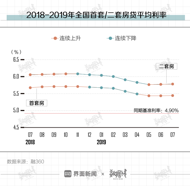 据融360大数据研究院,目前,全国房贷利率已进入反弹阶段。7月全国首套房贷款平均利率5.44%,环比上涨2个基点,相当于基准利率1.110倍。同时,二套房贷款平均利率为5.76%,环比上涨1个基点。
