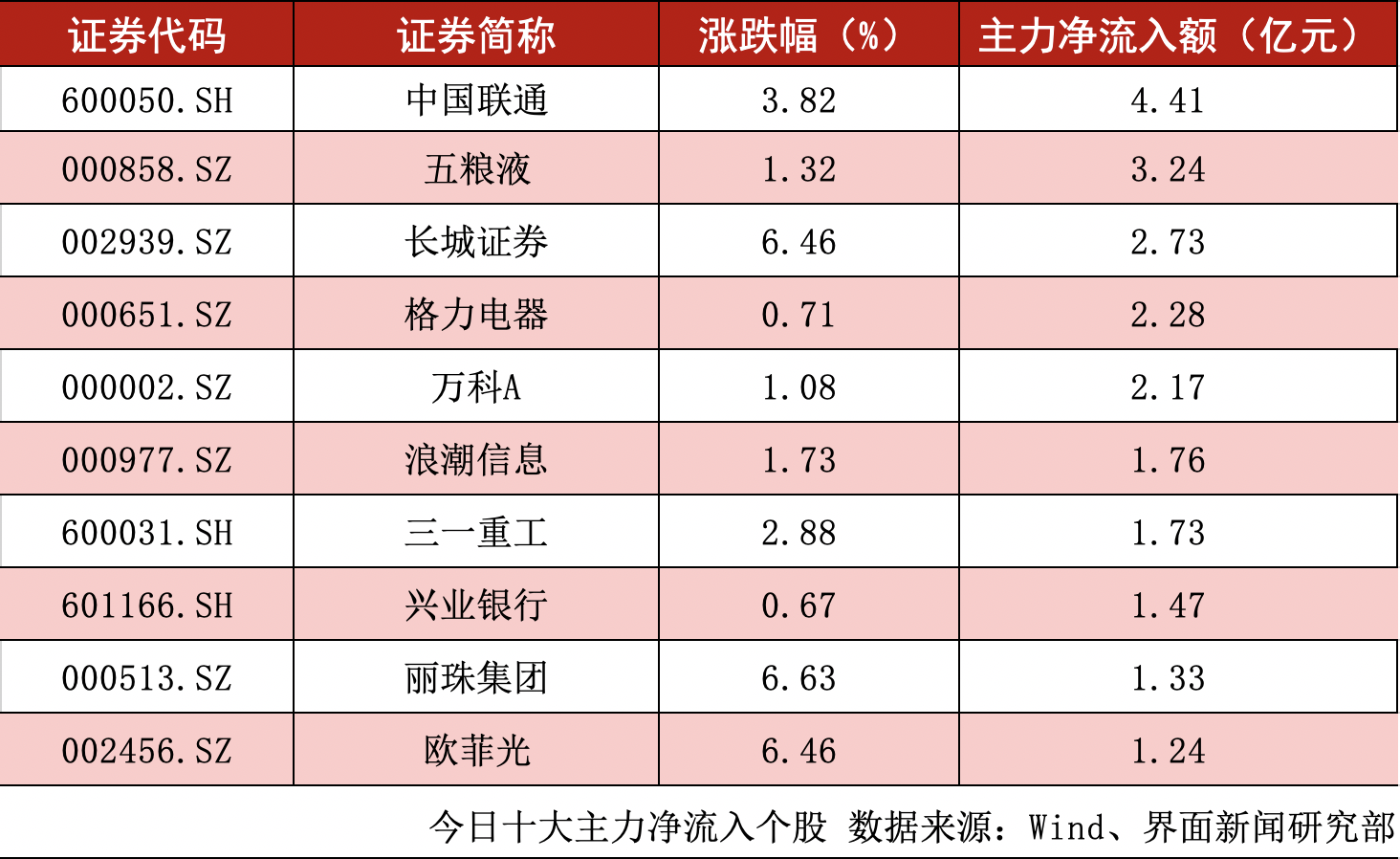 剔除尚未开板的新股及科创板股票,全天沪深两市主力净流入额超过1亿元的个股数量为14只。中国联通(600050.SH)、五粮液(000858.SZ)、长城证券(002939.SZ)的主力净流入额位居前三,分别为4.41亿元、3.24亿元、2.73亿元。