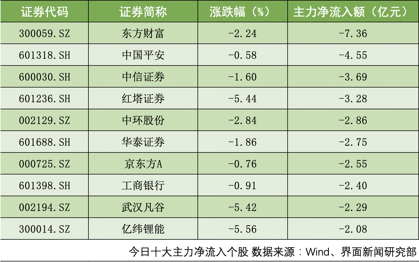 沪深两市共计49只个股主力净流出额超1亿元。东方财富(300059.SZ)、中国平安(601318.SH)、中信证券(600030.SHH)主力净流出额位居前三,分别为7.36亿元、4.55亿元、3.69亿元。