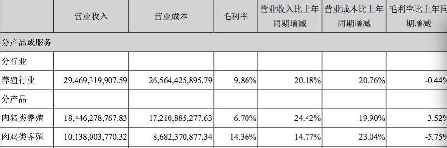 从毛利率来看,肉猪类养殖上半年毛利率为6.70%,较上年同期增长3.52%;肉鸡类养殖毛利率14.36%,较上年同期减少5.75%。