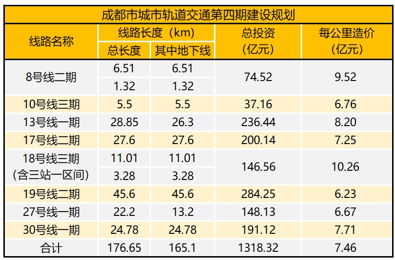 而在《成都市城市轨道交通第三期建设规划(2016~2020年)》中,造价最高的是8号线一期,每公里投资约8亿元。上一期规划的5条线路平均每公里的投资为6.69亿元,此次四期规划所有线路平均每公里的造价为7.46亿元。
