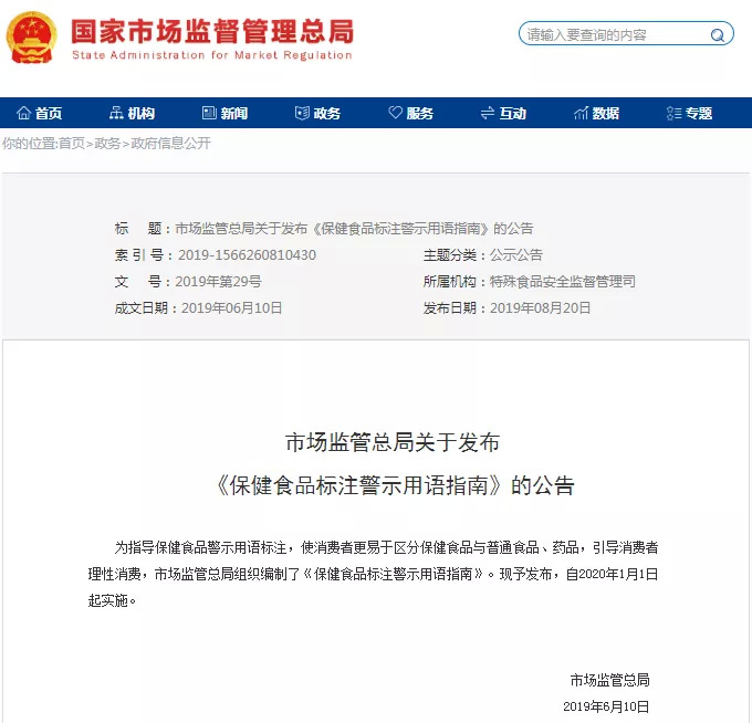 国家市场监管总局特殊食品司司长周石平说,《指南》除规定标签上显著标注“保健食品不是药物,不能代替药物治疗疾病”的警示用语、保质期外,还对标签标注服务电话、经营场所标注消费提示等也做了详细要求。据悉,《指南》将于2020年1月1日起正式实施。