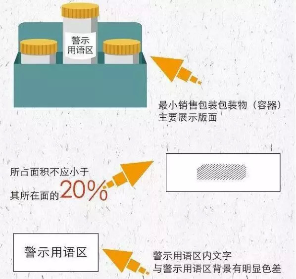 首先是设置警示区,提高关注度。要求警示区必须设置在最小包装物的主要展示版面上。
