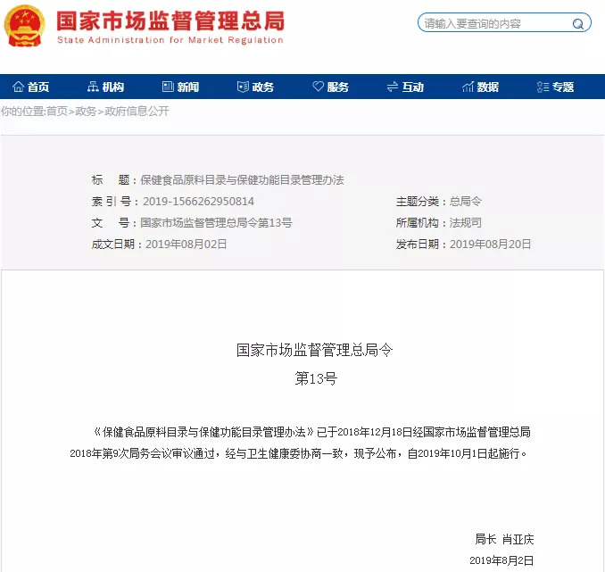 8月20日,市场监管总局正式发布《保健食品原料目录与保健功能目录管理办法》(以下简称《办法》)和《保健食品标注警示用语指南》(以下简称《指南》)两份文件,从产品市场准入和产品上市后监管两方面出发,聚焦历史遗留问题,着重基础性制度安排,为保健食品行业专项清理整治行动清除路障。