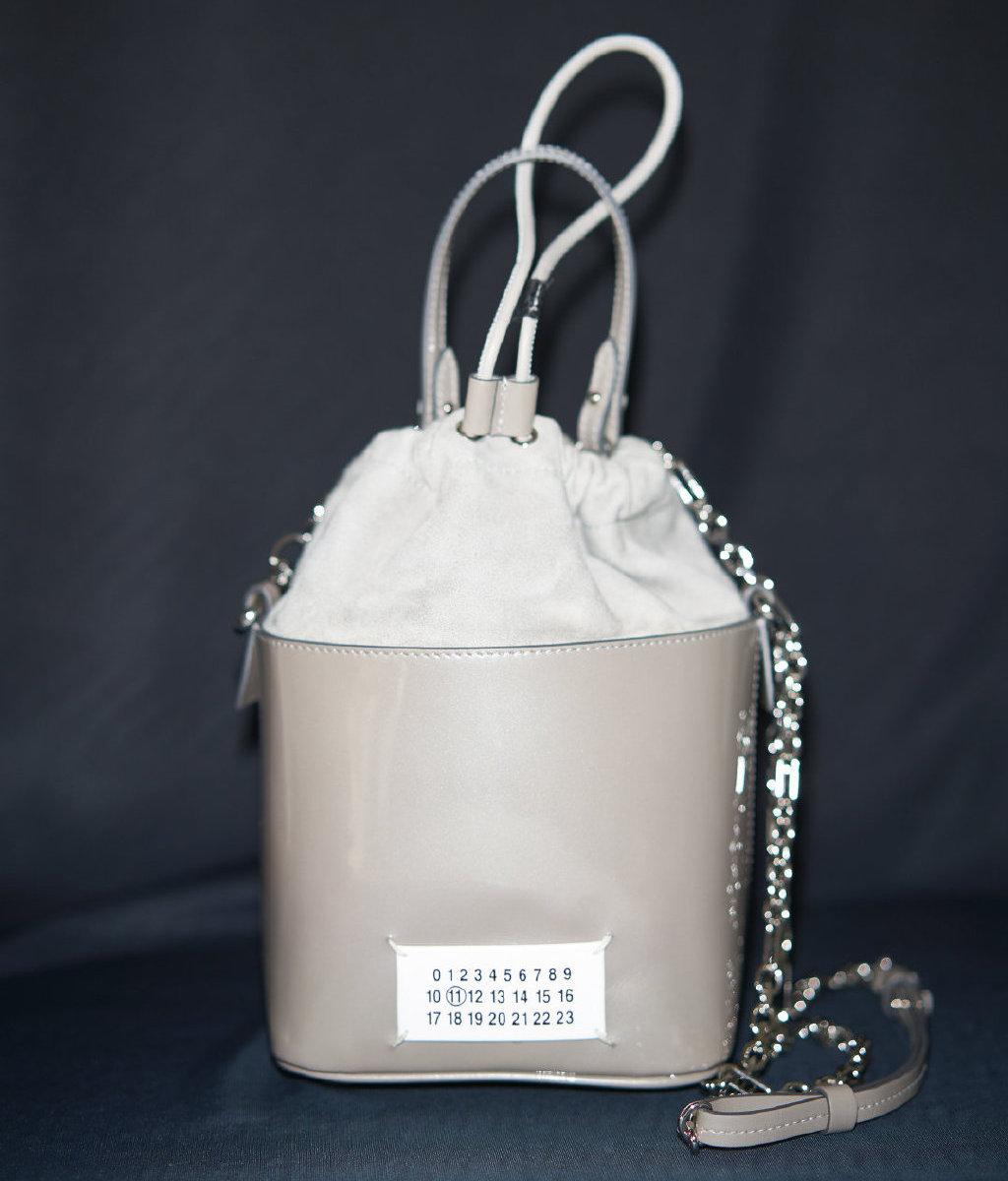 水桶包款式采用了拼接的手法进行设计。上部是柔软的布料,下部则是触感光滑的皮革,并将Maison Margiela经典的数字标记以刺绣手法镶嵌在上面。