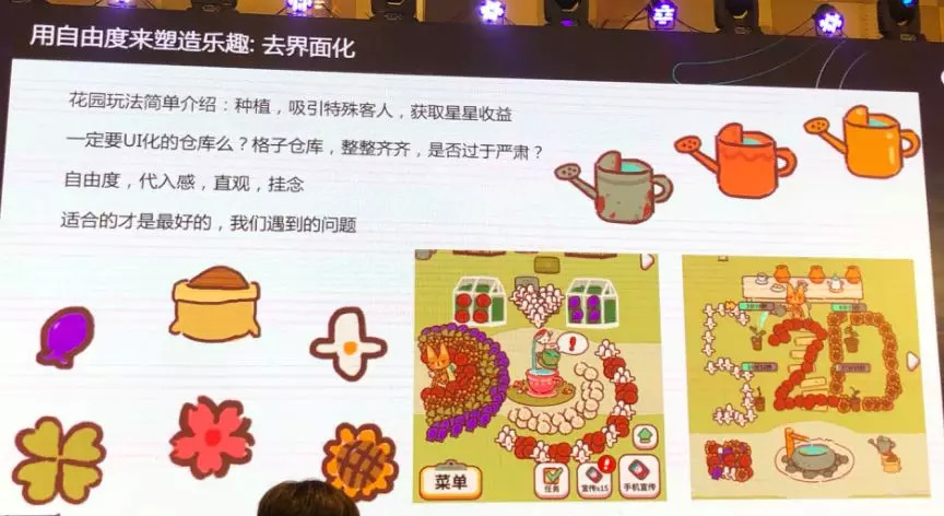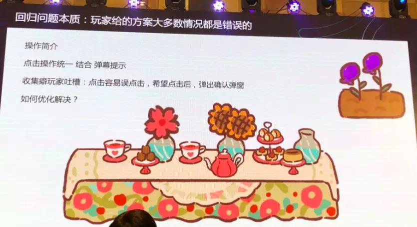 我们最终的目的是要利已,但想要达到这个目的首先要利他,就会成为欲取之先予之。我觉得我们处理这个问题的方法,就是要重视问题,但更要注重自己的目的。像花园里一个典型的系统是点击花朵之后,花朵将飞向瓶子,会供吃完饭的客人赏花,会进行一系列的消耗。这样一个操作会导致一个问题,假设花园里产生了一些非常珍稀的物品,点击后物品放到花瓶上被消耗掉,玩家就会觉得自己很吃亏,像自己失去了一些宝贝一样。
