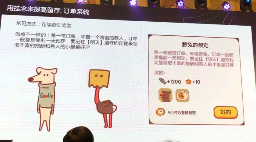 我们通过这个系统达到两个目的,第一个,这是逻辑自洽的,在餐厅里存在定单是很和谐的,没有天马行空;第二个,达到吸引玩家次日完成的目的。这个动作做完,次日留存有了非常棒的提升。