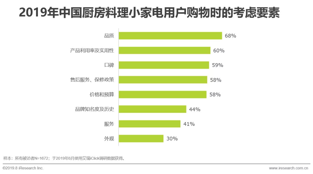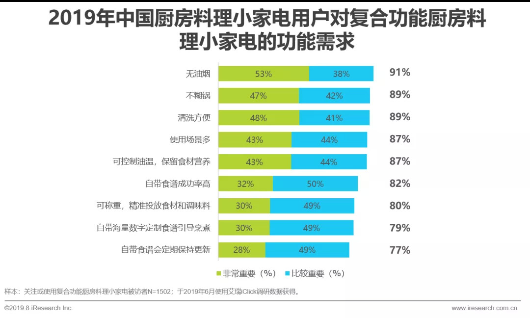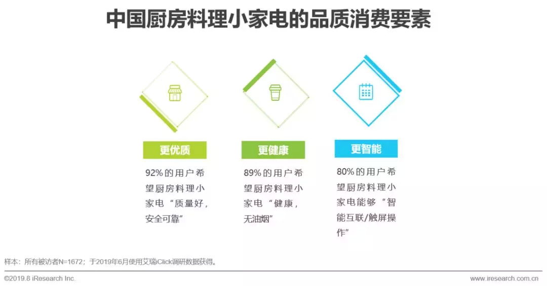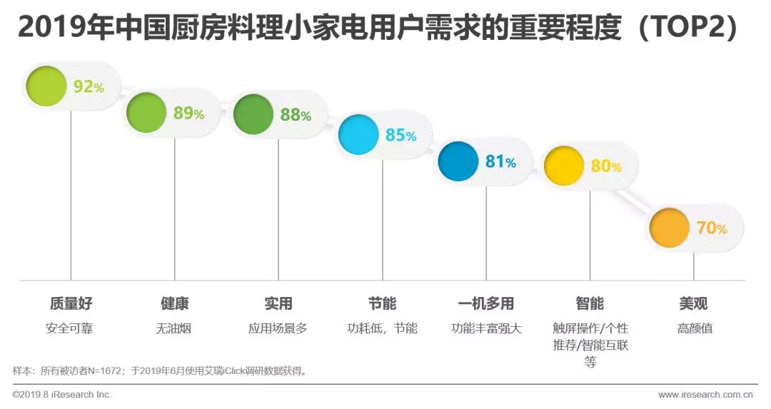 从需求来看,质量好(92%)、无油烟(89%)和应用场景多(88%)是中国厨房料理小家电用户最强的三大需求。