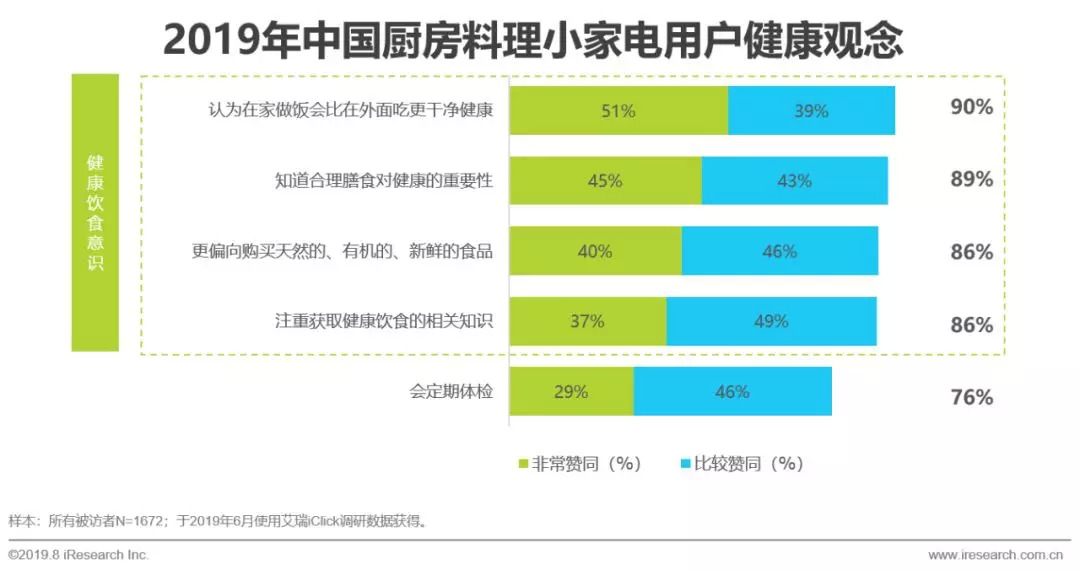 从健康观念上看,中国厨房料理小家电用户的健康饮食意识较强。90%的中国厨房料理小家电用户认为“在家做饭会比在外面吃更加干净健康”。