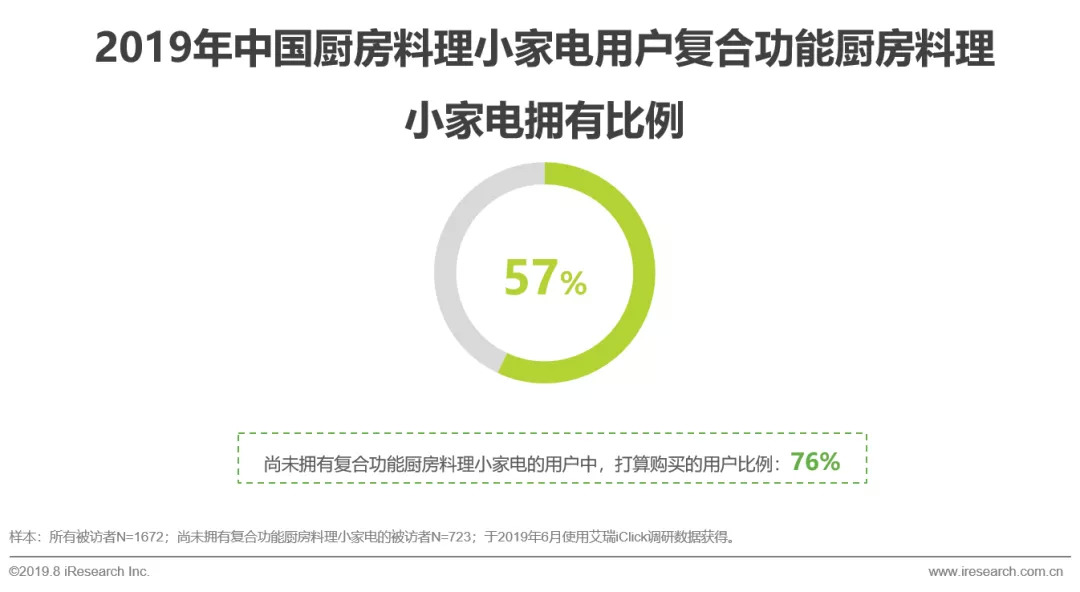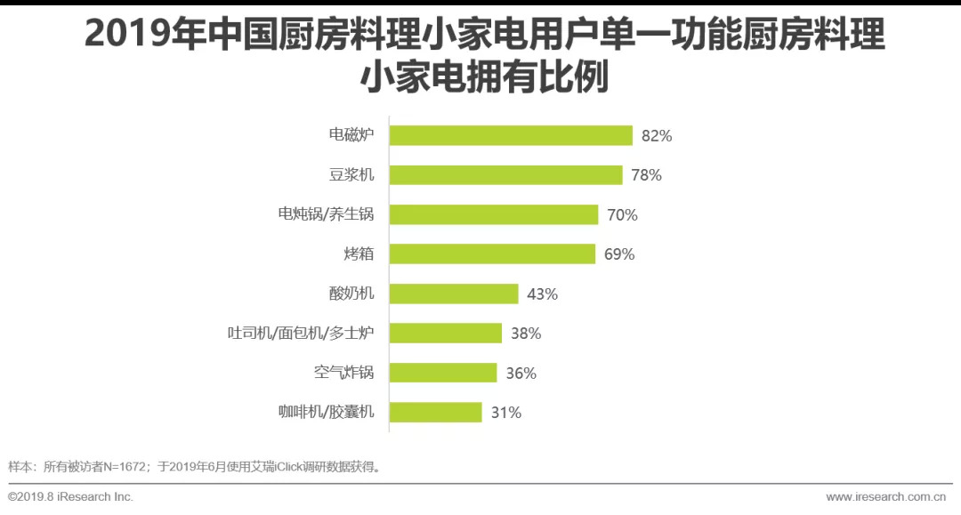 中国厨房料理小家电用户家中拥有比例较高的单一功能厨房料理小家电有电磁炉(82%)、豆浆机(78%)、电炖锅(70%)和烤箱(69%);复合功能厨房料理小家电拥有比例达57%,而尚未拥有复合功能厨房料理小家电的用户中,有76%的用户有购买打算。
