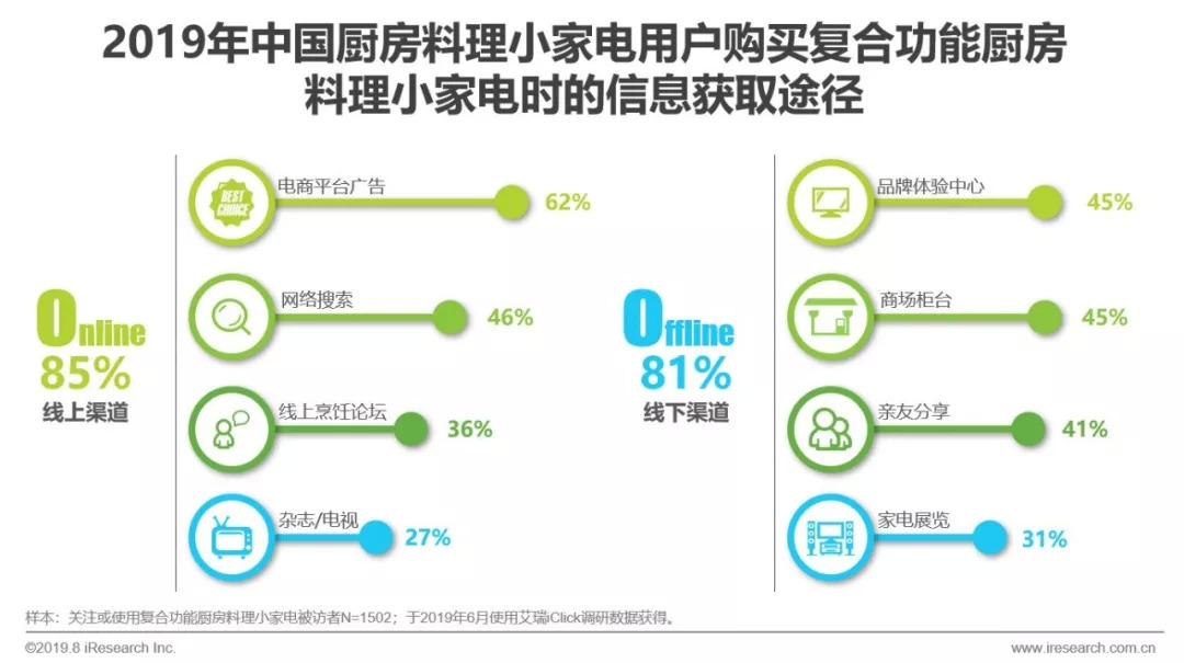 中国厨房料理小家电用户在购买产品前会综合线上线下渠道获取产品信息,最偏向的线上渠道是电商平台广告(62%),最偏向的线下渠道是品牌体验中心(45%)和商场柜台(45%)。