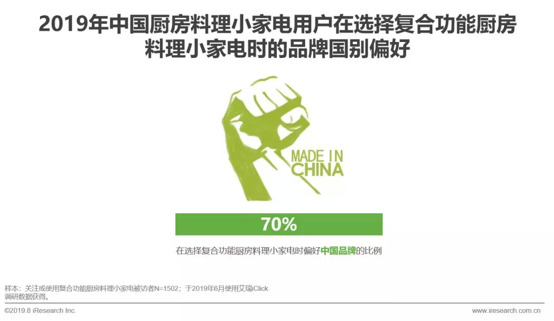 中国厨房料理小家电用户在选择复合功能厨房料理小家电时最偏好的品牌是“中国品牌”(70%)。改革开放40年来,中国家电制造行业从模仿到创新,逐渐成为较有国际竞争力的产业之一,“中国品牌”也越来越为消费者所认可。