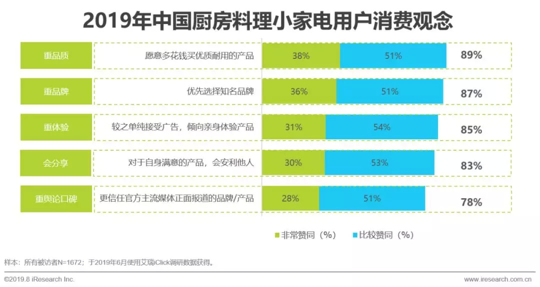 从消费观念上看,89%的中国厨房料理小家电用户“愿意多花钱买优质耐用的产品”,87%的中国厨房料理小家电用户会“优先选择知名品牌”,85%的中国厨房料理小家电用户倾向“亲身体验产品”。