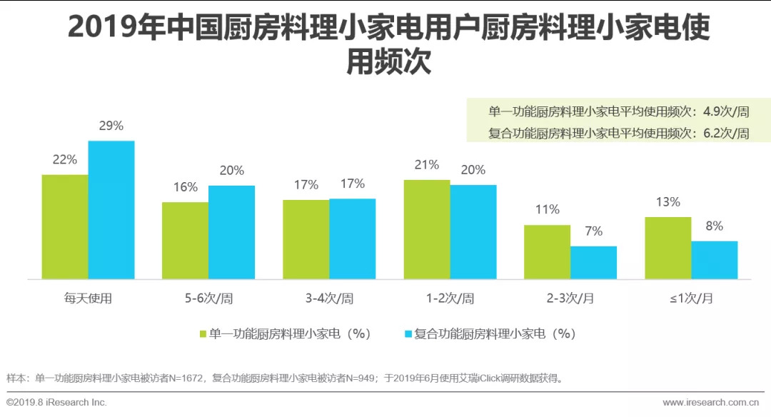 从使用频次上看,较之单一功能厨房料理小家电,中国厨房料理小家电用户使用复合功能厨房料理小家电的频次更高,每日都使用的占比为29%,平均每周使用频次为6.2次。