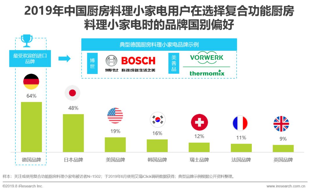 从品牌国别偏好上看,“德国品牌”(64%)是中国厨房料理小家电用户在选择复合功能厨房料理小家电时最偏好的进口品牌。