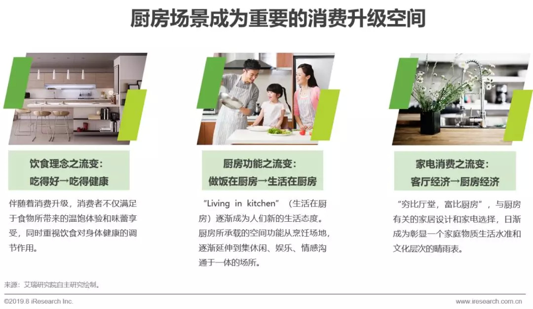 “民以食为天”,中国居民是世界上最重视“吃”的族群之一。随着消费升级,人们已不仅满足于食物所带来的温饱体验和味蕾享受,还重视饮食的营养健康。消费者更加注重饮食对身体健康的调节作用,愿意将更多的钱花费在饮食健康上。厨房功能也发生了一定的变化,从传统的“做饭在厨房”向“生活在厨房”转向,中国家电消费正不断从过往的“客厅经济”向“厨房经济”转型。