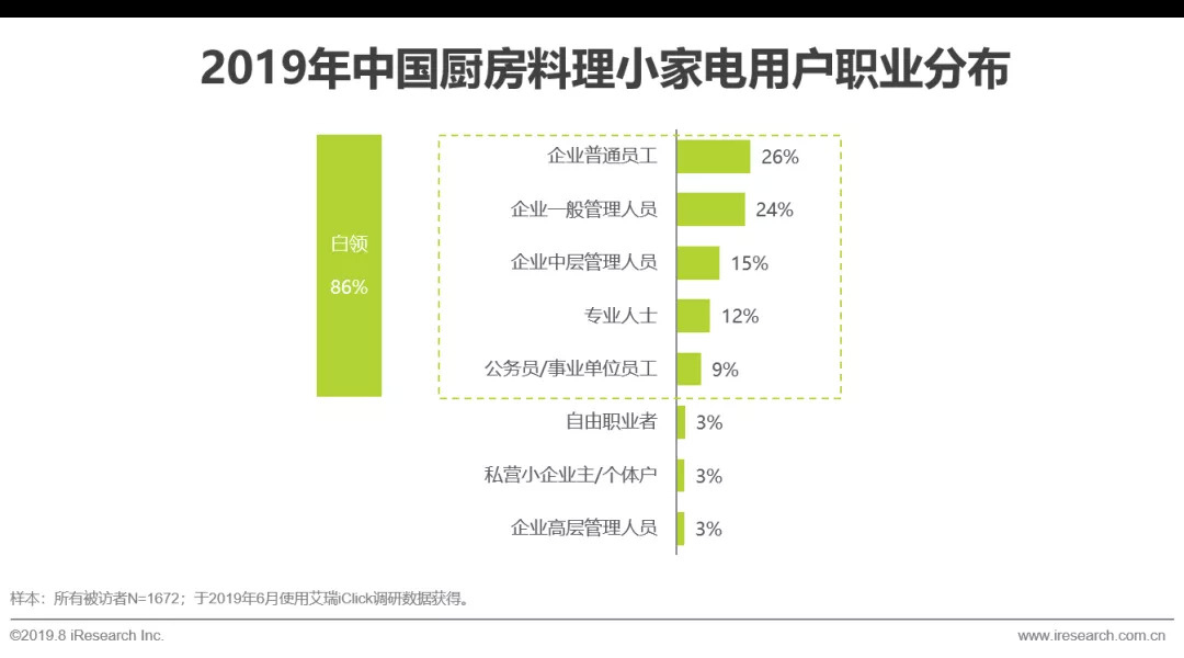从职业上看,中国厨房料理小家电用户中白领阶层占比较高,达86%;从学历上看,96%的中国厨房料理小家电用户受过高等教育;从家庭收入来看,家庭月收入超1.2万的中高收入用户占比70%,家庭月均收入达1.76万元。