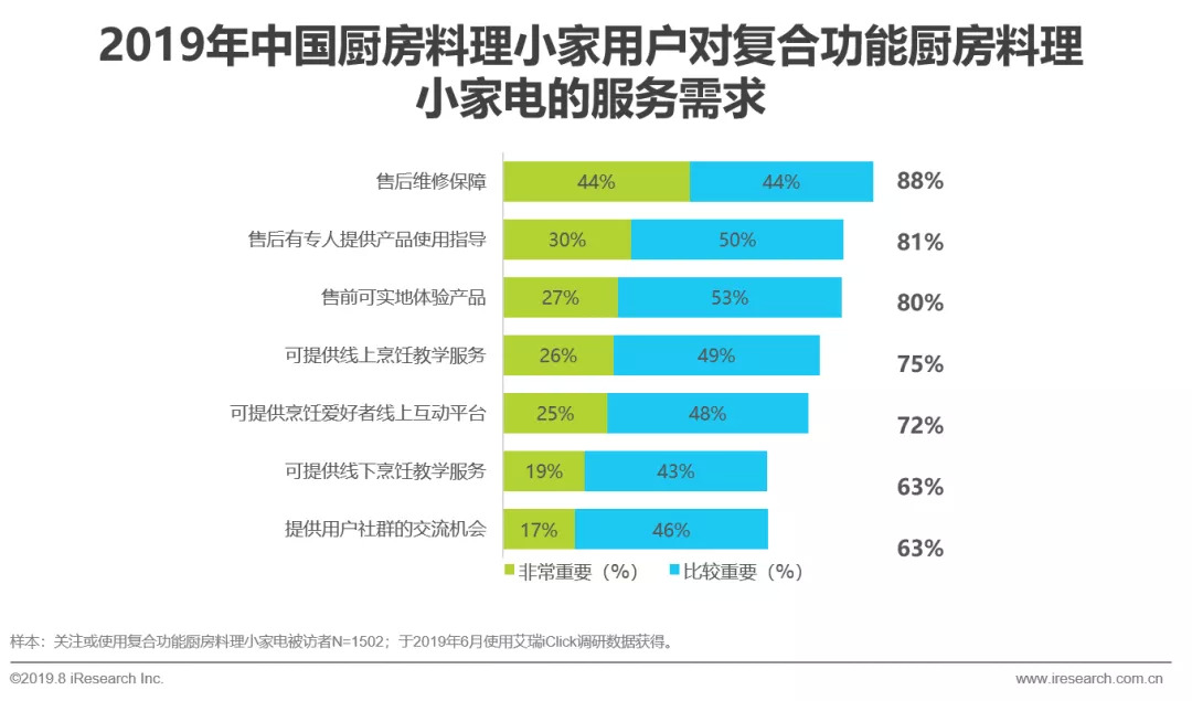 从服务需求上看,中国厨房料理小家电用户对“售后维修保障”(88%)、“售后有专人提供产品使用指导”(81%)、“售前可实地体验产品”(80%)的需求度高。