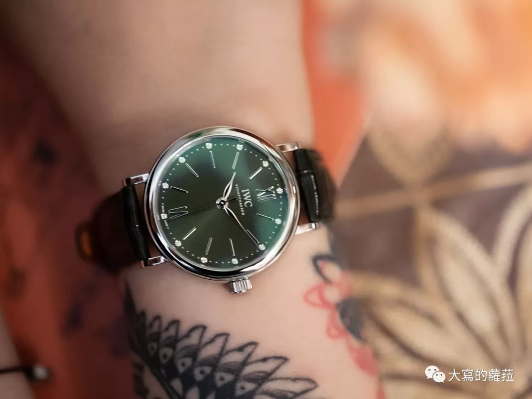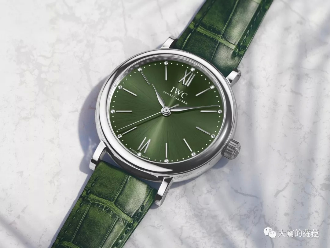 △ IWC万国表柏涛菲诺自动腕表34,精钢表壳,绿色面盘镶嵌12颗钻石,搭载35100自动机芯。(图片版权归属IWC万国表)