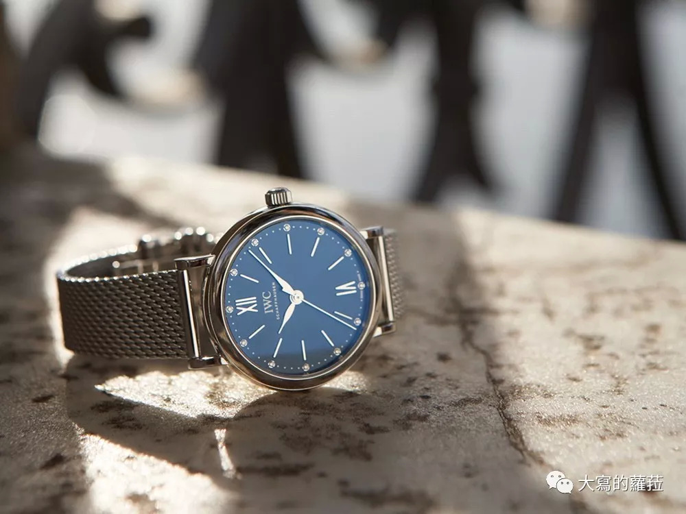 △ IWC万国表柏涛菲诺自动腕表34,精钢表壳,蓝色面盘镶嵌12颗钻石,搭载35100自动机芯。(图片版权归属IWC万国表)