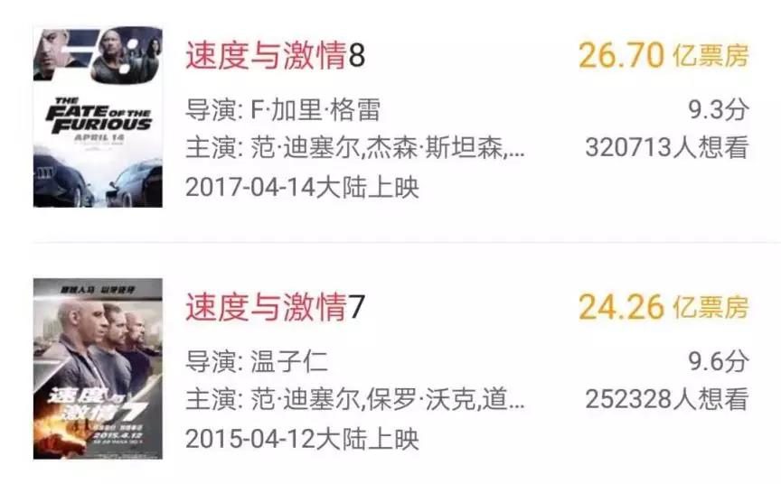 这也让中国市场展现出对《速度与激情》系列电影的无限优待。2015年,《速度与激情7》在内地收获24.26亿票房,2017年,《速度与激情8》揽下了26.70亿票房,相比起系列前作,这两部电影的票房几乎迎来了爆发式增长。