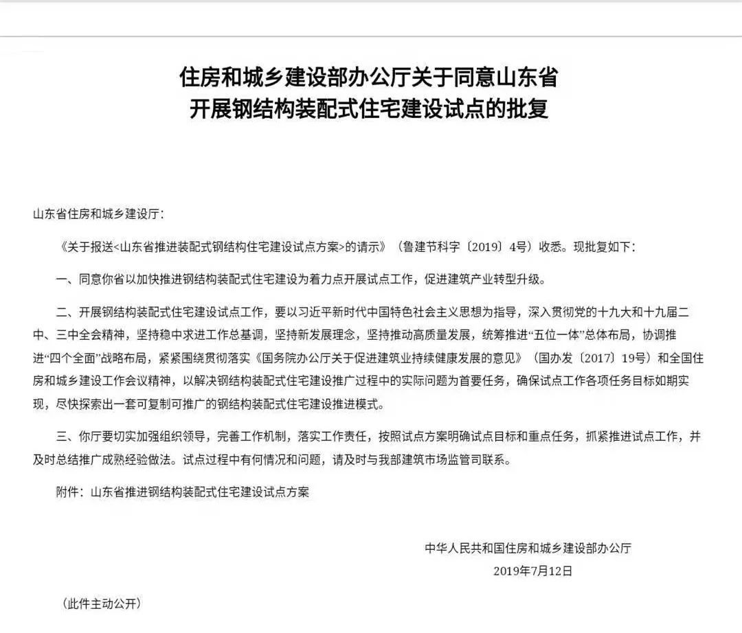 近日,山东省住建厅下发《关于扎实开展钢结构装配式住宅建设试点创建工作的通知》,要求2019年8月31日前完成编制相关地区试点方案。