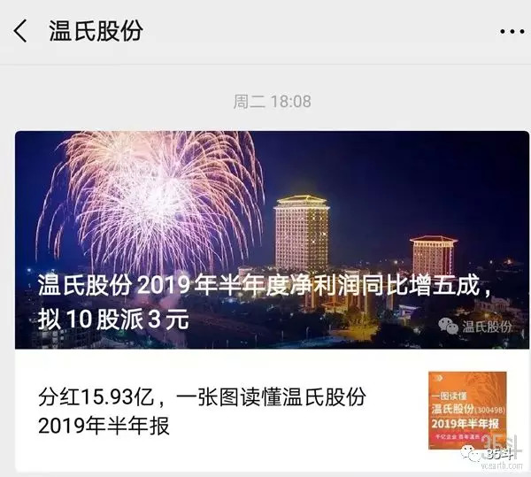 创业板“一哥”、养猪巨头温氏股份发布2019半年报。几乎同时,其官方微信公众号上也发布了两则消息,头版“温氏股份2019年半年利润同比增五成,拟10股派3元”,次版“分红15.93亿,一张图读懂温氏股份2019年半年报”。前者还用了颇有庆祝意味的“烟花盛开图”做封面。