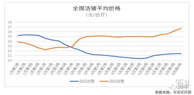 根据农业农村部数据,2019年6月份第4周,全国活猪平均价格16.72元/公斤,同比上涨46.5%。