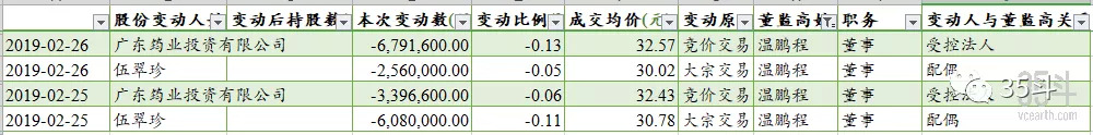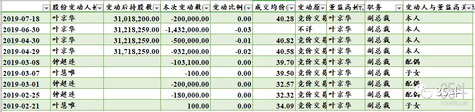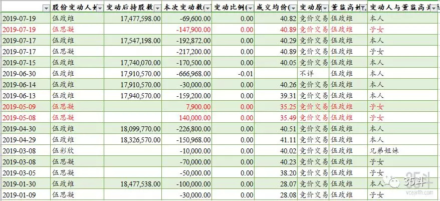 以监事会主席伍政维为例,今年1月9日到7月19日间,其个人通过9次操作,共减持170余万股,成交均价最低为28.07元,最高为40.82元。同时,其兄妹伍彩欣于2019年3与8日以40.02元的价格卖出1万股。